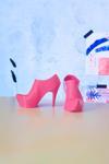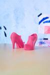 Modern tasarımıyla evinizin dekorasyonuna şıklık katan pembe renkli topuklu ayakkabı çifti, özel üretim bioplastik materyalden üretilmiştir