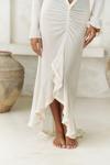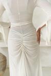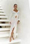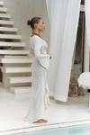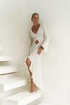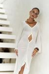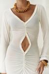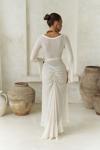 Uzun kollu, göğüs ve bel kısmı pencere detaylı uzun transparan elbise. Önü büzgü detaylı, etek ucu yırtmaçlı ve uç kısımları dantel biye ile tamamlanmıştır. Vücuda oturan formda ve astarsızdır.