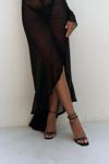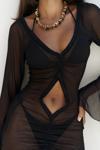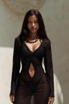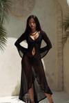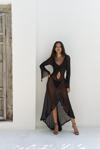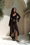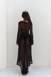 Uzun kollu, göğüs ve bel kısmı pencere detaylı uzun transparan elbise. Önü büzgü detaylı, etek ucu yırtmaçlı ve uç kısımları dantel biye ile tamamlanmıştır. Vücuda oturan formda ve astarsızdır.