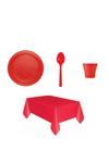 - Plastik tabak, bardak, masa örtüsü ve kaşık gibi temel sofra gereçleriyle birlikte gelir
