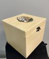 - 15x15 cm ölçülerinde doğal ahşaptan üretilmiş bu özel kutunun kapağında, amorf formda hazırlanmış ve elle boyanmış özgün bir seramik plaka yer alır.