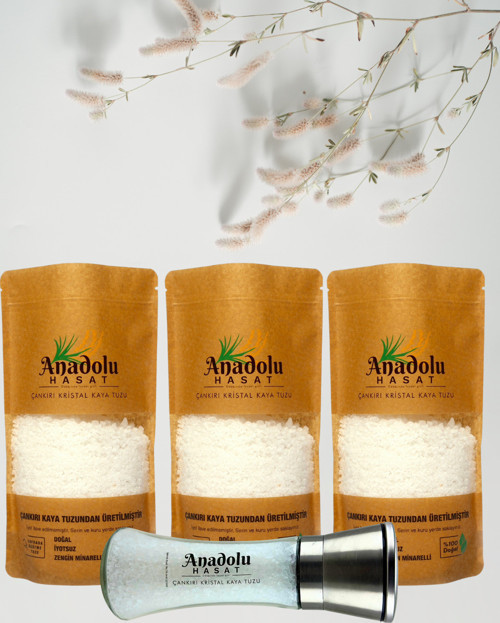 Anadolu Hasat 3 Adet-Çankırı Kristal Sofrada Öğütme Kaya Tuzu 1Kg-Seramik Bıçaklı Baharat Ve Tuz Değirmeni Öğütücü
