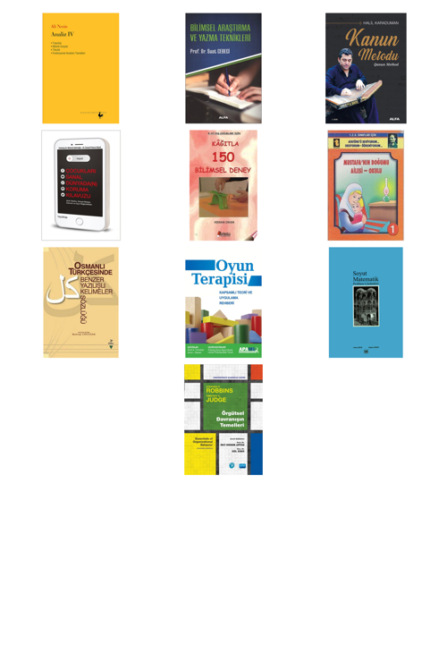 Analiz 4 - Bilimsel Araştırma Ve Yazma Teknikleri - Kanun Metodu - Kapat! Çocukları Sanal Dünyada(n) Koruma Kılavuzu - Kağıtla 150 Bilimsel Deney - Mustafa’nın Doğumu - Ailesi - Okulu - Osmanlı Türkçesinde Benzer Yazılışlı Kelimeler Sözlüğü - Oyun Terapisi - Soyut Matematik Problem Çözümleri - Örgütsel Davranışın Temelleri