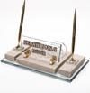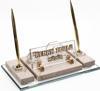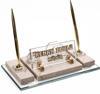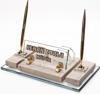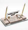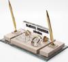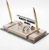 Mermer İsimlik üzerine altın renkli ve kristal aksesuarlarla dekore edilmiştir. Altın renkli iki adet tükenmez kalem ,kristal kartvizitlik, saat alanı ve ayaklı kristal isimlik alanından oluşmaktadır.