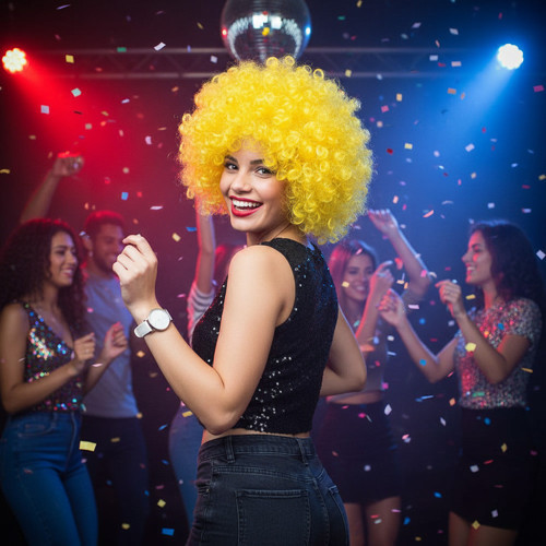 Animasyon Parti Ve Palyaço Peruğu - Sarı 1. Sınıf fiber sentetiktir. Kısa, yoğun dalgalı, kıvırcık bir modeldir. Animasyon, parti ve palyaço peruğudur, renklidir. Tepe hariç 15 - 20 cm ve 150 - 200 gr civarındadır. İçi filelidir, hava alabilen özel bir yapısı vardır. İç kısmı esnektir, her kafa yapısına uyum sağlayabilir.