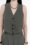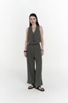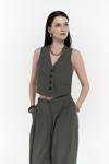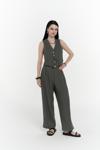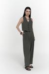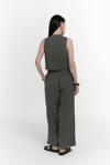 Keten karışımlı, halter yaka, kplsuz V yaka yelek, Biyeli yalancı ön cepli ve önü düğmeli. Keten karışımlı kumaştan, orta bel palazzo pantolon. Ön cepli ve kapaklı yalancı arka cepli. Önü fermuarlı, düğme kapamalı.