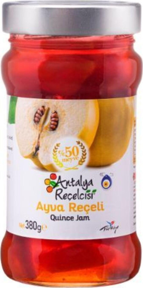 Ayva Reçeli 380 G Klasik Seri 380 gram ağırlığındaki Ayva Reçeli, cam kavanozunda tüketiciye sunulmaktadır. Ayva Reçeli %50 meyve içerir. Katkı maddesi içermeyen ev tipi reçeli tüketirken meyve aromasını tam lezzetiyle alabilirsiniz. Antalya reçelleri, meyve ve sebzelerin tam olgunluk zamanında toplanarak işlenmesi sonucu elde edilmektedir. Tüm ürünler vakumlu kazanlarda ve 60 dereceyi aşmayan ısıda pişirilerek
