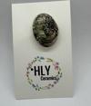 Eski çağlardan esinlenerek tasarlanan bu el yapımı seramik broş, kabartma yüz detayıyla dikkat çeker.