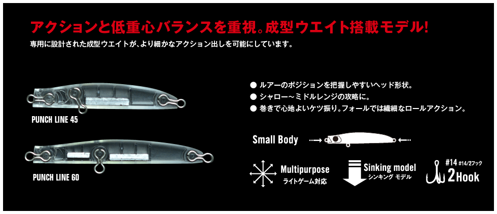 60mm boyutunda bagetlerden mikroyemlere uyumludur. Aşağıdan ısırıkları tetiklemek için yüzeye yakın hafifçe yüzün. Menzil sayılırken bile küçük de olsa yuvarlanma düşme hareketine neden olur ve av aralığına ulaşacak kadar çekmeyi mümkün kılar. Yemin nadir olduğu kış ortası ve baget desenlerinde gücünü göstermesinin yanı sıra, kaya balıklarının yoğun olduğu ilkbahardan yaz başına kadar sığ bölgelerdeki balık şeklindeki yem desenleriyle de en iyi eşleşmedir. Kaya balıklarını ve diğer kaya balıklarını hedeflemenin yanı sıra, liman bölgesinde hafif olta takımı ile oynanabilen levrek balıklarını da hedeflemenizi öneririz.