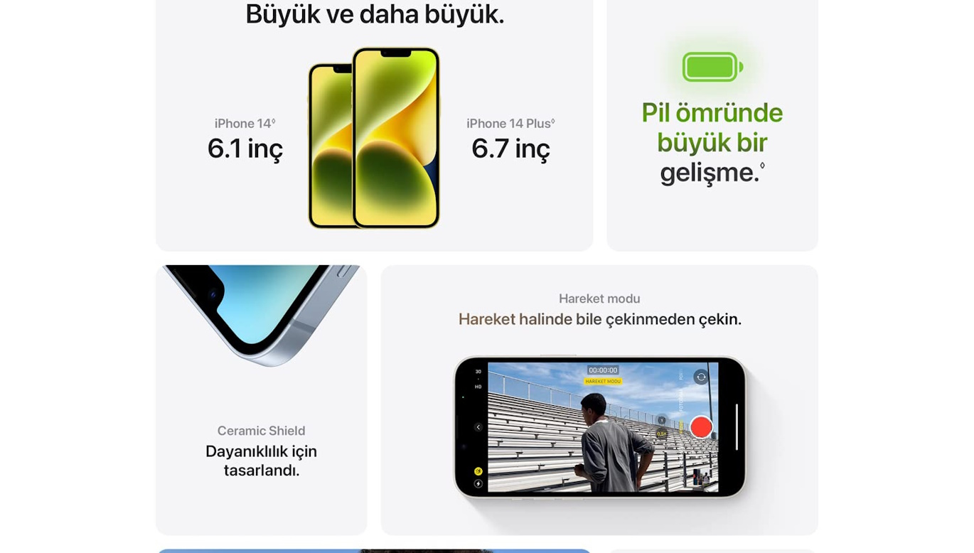 Size bir uyarı göndererek iyi olup olmadığınızı sorguluyor ve eğer bu uyarıya yanıt vermezseniz sizin yerinize acil yardım çağırıyor. Aynı zamanda eğer varsa acil durum kişilerinizi de durumdan haberdar ediyor. Apple iPhone 14 modelleri, batarya özellikleri ile de öne çıkıyor. Apple iPhone 14 batarya özellikleri sayesinde yüksek verimlilik ve uzun kullanım süreleri sunuyor. 20 saate kadar video oynatma süresine sahip 3279 mAh batarya, lityum iyon teknolojisi ile destekleniyor. Böylece uzun süre ilk günkü performansını koruyan akıllı telefonunuz, 20 W hızlı şarj desteğiyle ise en kısıtlı zamanlarda bile kısa bir süre içerisinde tam dolum gerçekleştiriyor.
