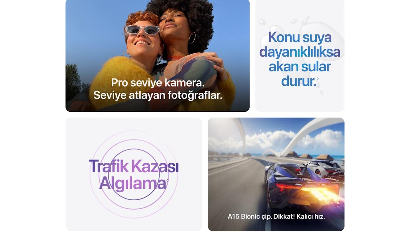 Apple iPhone 14 özellikleri ile kullanıcıların günlük yaşamını büyük ölçüde kolaylaştırıyor. Bu ürün, Apple’ın en yeni çiplerinden biri olan A15 Bionic ile tasarlanıyor. A15 Bionic sayesinde yüksek hız ve verimlilik sağlayan Apple iPhone 14, 6 çekirdek işlemci, 3.2 GHz frekans ve 5 nm üretim teknolojisi gibi özellikleri ile kullanımını kolaylaştırıyor. Apple iPhone 14 akıllı telefonda 5 çekirdekli GPU da bulunuyor. Bu grafik işlemci, hem en yeni özelliklere güç sağlıyor hem de AR uygulamalarının ultra akıcı hale gelmesine olanak tanıyor. A15 Bionic çip iç tasarımı, bu modelde yenileniyor. Böylece termal verimlilik iyileştiriliyor ve oyunlardaki aksiyon daha uzun süre devam edebiliyor. Apple iPhone 14, yeni bir güvenlik özelliğini de kullanıcıların hayatına ekliyor. Yeni Trafik Kazası Algılama fonksiyonu, ciddi bir araba kazası geçirmeniz durumunda bunu algılıyor.