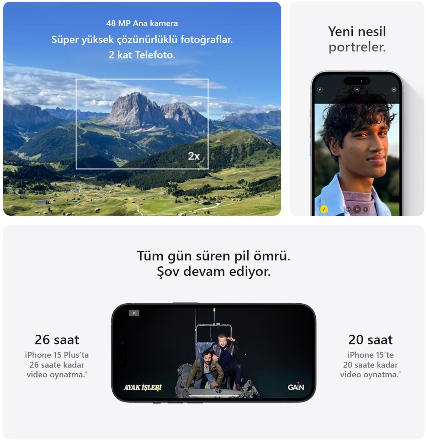 Yeni USB-C konnektörü sayesinde, iPhone 15’inizi şarj ettiğiniz kabloyla Mac’inizi veya iPad’inizi de şarj edebiliyorsunuz. Hatta iPhone 15’inizi Apple Watch veya AirPods şarj etmek için kullanabiliyorsunuz. Kablo yığınlarına veda edebilirsiniz.