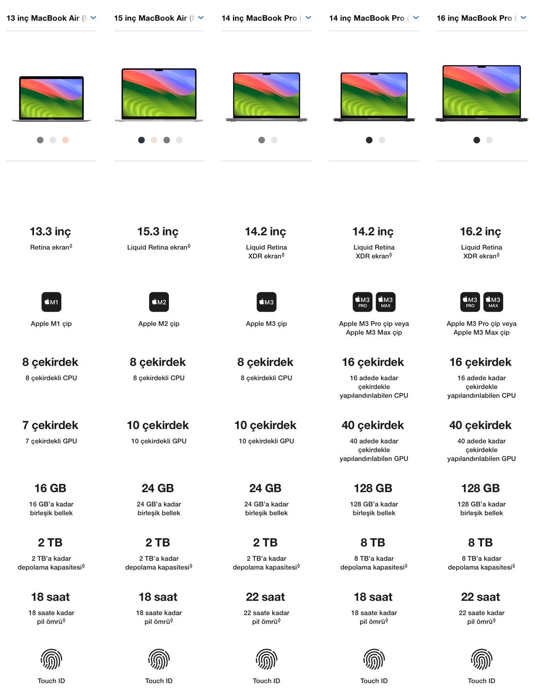 Ekran: Ekran boyutu diyagonal olarak ölçülür. Diyagonal olarak ölçüldüğünde 24 inç iMac ekranının gerçek boyutu 23.5 inçtir. M2 çipli 13 inç ve 15 inç MacBook Air ile 14 inç ve 16 inç MacBook Pro ekranları, üst kısımda yuvarlatılmış köşelere sahiptir. Standart bir dikdörtgen olarak ölçüldüğünde ekranlar diyagonal olarak 13.6 inç, 15.3 inç, 14.2 inç ve 16.2 inçtir (görüntülenebilen gerçek alan daha azdır).