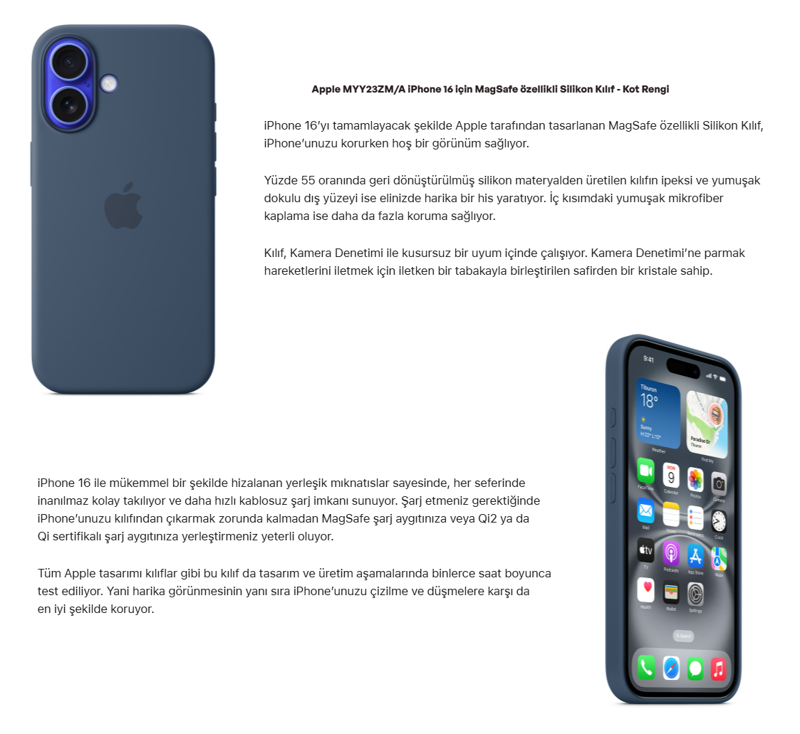 Apple MYY23ZM/A iPhone 16 için MagSafe özellikli Silikon Kılıf - Kot Rengi