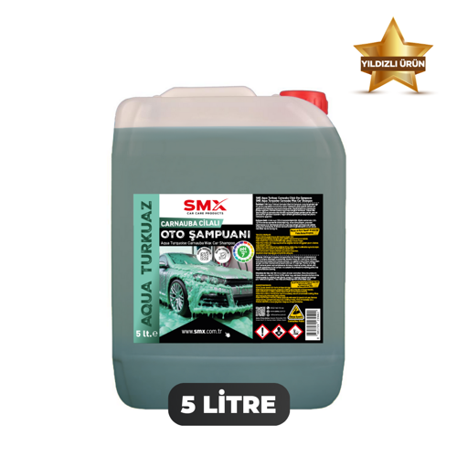 Özellikleri: SMX Aqua Turkuaz Carnauba Cilalı Turkuaz Oto Şampuanı, araç yüzeyindeki ağır kir, yol kiri, yağ lekeleri ve kurumuş çamur kalıntılarını güçlü şekilde çözmek için geliştirilmiş profesyonel oto yıkama şampuandır. Köpük püskürtme makinesiyle yüzeye uygulanır; ardından basınçlı suyla veya süngerle temizlenir. Yüksek leke çıkarma gücü ve carnauba cilalı formülü sayesinde yüzeye yeniden parlak, canlı ve pürüzsüz bir görünüm kazandırır. Yoğun temizlik gerektiren profesyonel yıkama noktalarına uygundur.