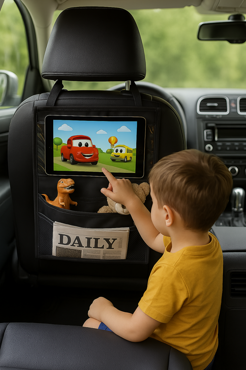 Çocuklu yolculuklar artık daha keyifli ve düzenli! Araç koltuğu arkasına kolayca takılan bu tablet bölmeli çocuk organizeri, hem çocukları eğlendirir hem de dağınıklığı önler. Oyuncak, kitap, şişe ve gazete gibi birçok eşya için özel bölmelere sahiptir. Üstelik şeffaf ön yüzü sayesinde tabletinizi kolayca kullanabilirsiniz.