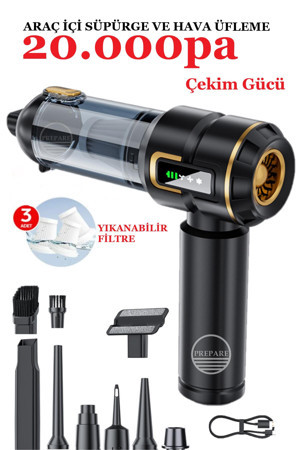 Prepare Kablosuz Araç İçi Süpürge 20.000PA Basınçlı Üfleme ve Çekme Süpürgesi 12 Parçalı Temizleme Seti