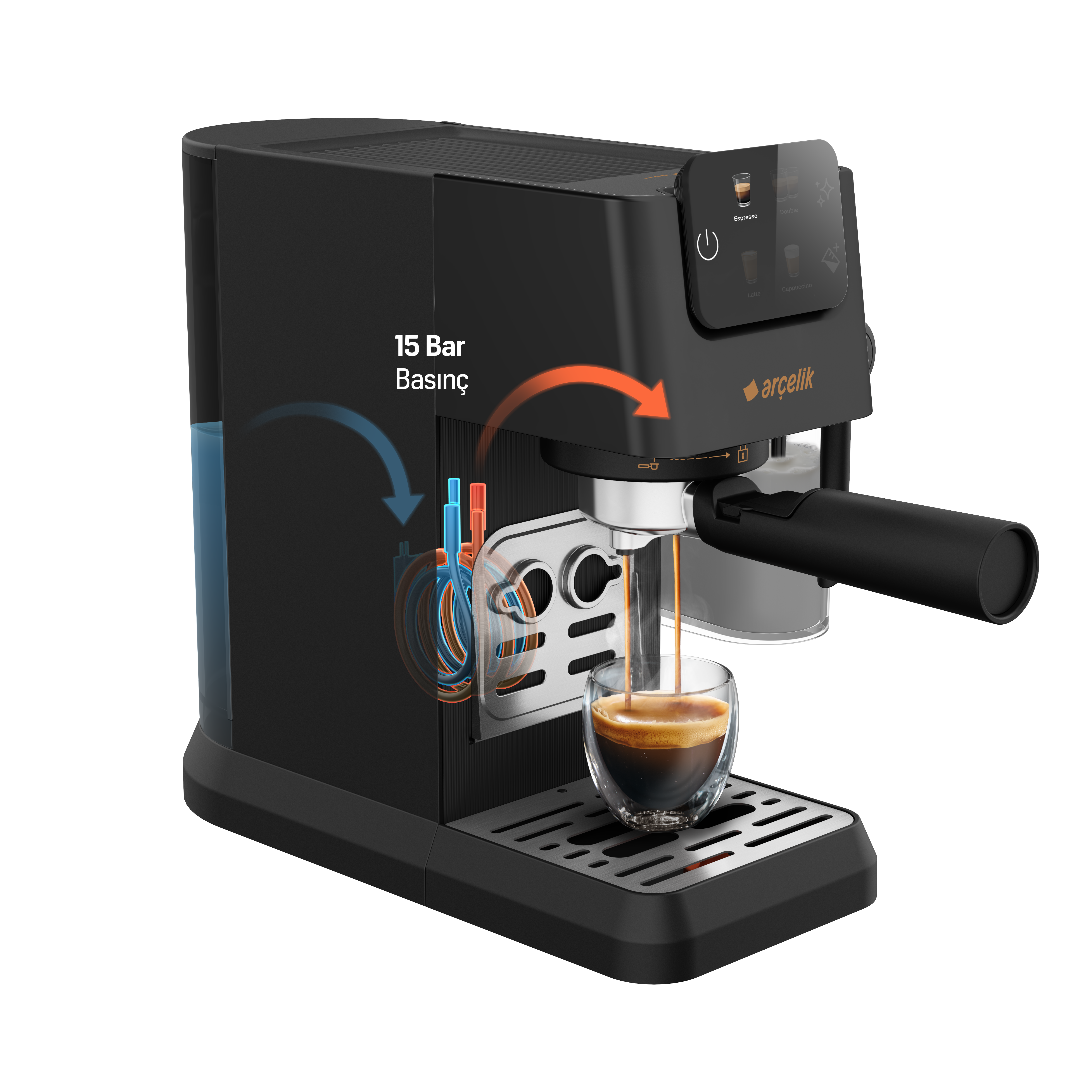 Kullanıcı dostu renkli dokunmatik ekranıyla tek tuşla hızlı ve kolay şekilde Espresso, Double, Latte ve Cappuccino gibi çeşitli kahveler hazırlayabilirsiniz.