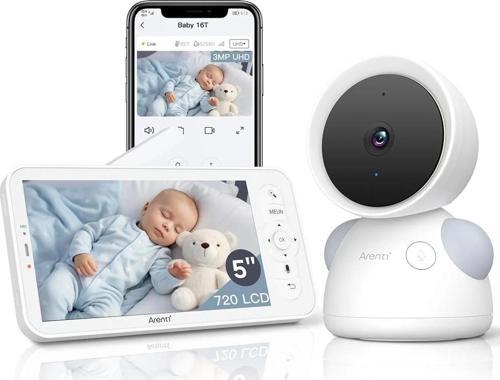 ARENTI Baby Monitor, 2K/3MP WiFi 6 Camera and Audio, 5-inch Wireless Screen, Smartphone App, Super Night Vision, Crying Detection, Auto Tracking, Temp&Humidity Sensor, Cloud&SD Card Storage (D3 Kit)
