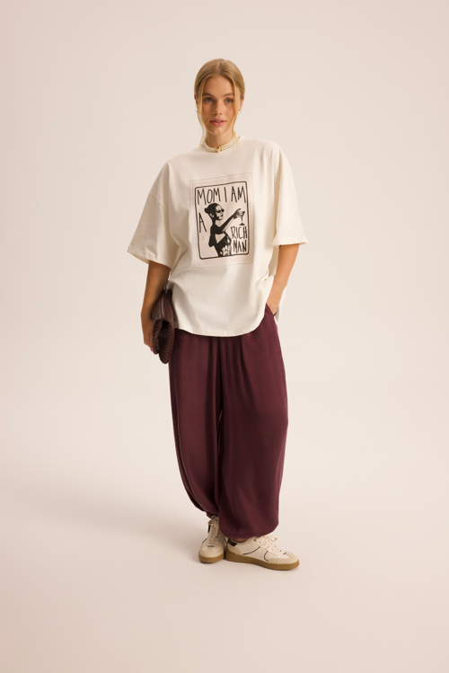 Rahat formda, pile görünümlü yanları cepli, paçası ayarlanabilir ipli, lastikli salaş şalvar pantolon.