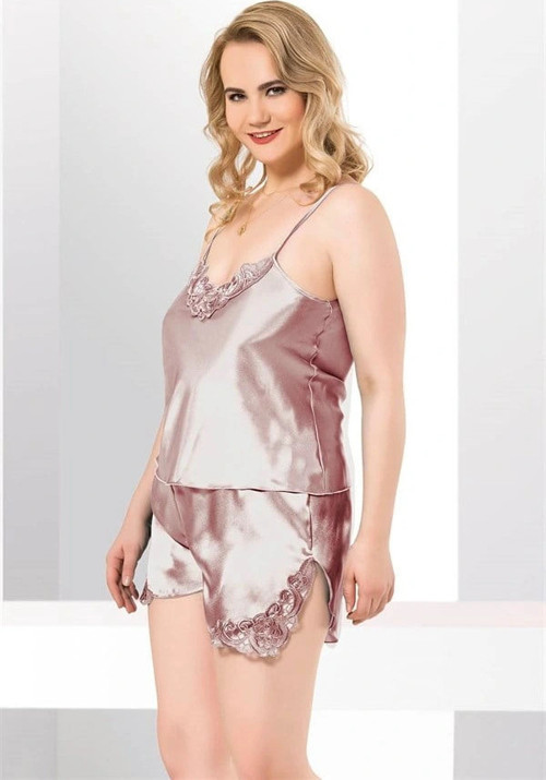 Arias Closet Büyük Beden Vizon Saten Babydoll Şort Takımı