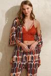 Aria's Closet Dokuma Viskon Geometrik Baskılı Sabahlık Balensiz Desteksiz Dolgusuz Yaka Detaylı Dantelli Büstiyer Sütyen ve Pantolon Pijama 3'lü Takım