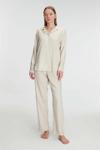 Uzun Kol Çizgili Gömlek ve Pantolon Takım Pijama Takımı ile konforlu bir uyku deneyimi yaşayın. 50 % Viskoz 25 % Pamuk 25 % Poliester kumaşı ile vücudunuza yumuşak bir dokunuş sağlar. Bu pijama takımı, özellikle soğuk gecelerde sıcak kalmanızı sağlayan uzun kollu tasarımı ile öne çıkıyor.
