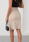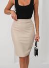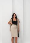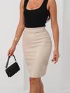Arkadan yırtmaçlı kalem etek bej, şıklığı ve zarafeti bir arada sunar. Hem günlük kullanıma uygun hem de özel davetlerde tercih edilebilecek bir parçadır.