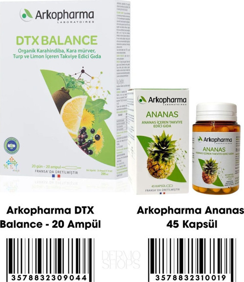 Arkopharma 2 li Detox Paket | DTX Balance 20 Ampül & Ananas 45 Kapsül | Orijinal Boy Set içeriği 1 Adet Arkopharma DTX Balance 20 ampül 1 adet Arkopharma Ananas 45 Kapsül