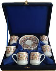 Kütahya Armada çini porselen fincan takımı 6 adet fincan ve 6 adet altınyaldızlı çini desenli fincanı ve tabağından oluşur.