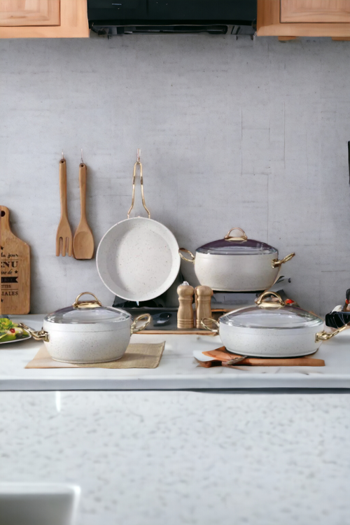 ARMONİ SERİSİ 7 PARÇA GRANIT GÜVEÇ TENCERE TAVA SETİ | GRANIT TENCERE SETİ CAM KAPAKLI BEYAZ