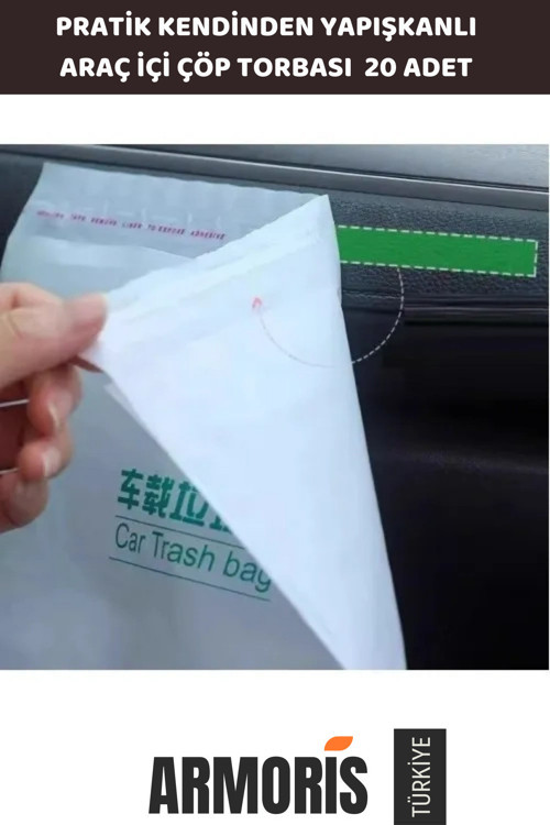 Ürün Özellikleri: ; ; Pakette 20 adet tek kullanımlık çöp poşeti ; ; Su geçirmez materyal ile sıvı sızıntılarına karşı koruma ; ; Kendinden yapışkanlı bant sayesinde kolay montaj (kapı içi, torpido gözü, koltuk arkası vb.; ) ; ; Ölçü: 23 x 18.5 cm Tek kullanımlık; hijyen ve pratik kullanım sağlar ; ; Paket İçeriği: ; 20 adet su geçirmez oto araba çöp poşeti ;