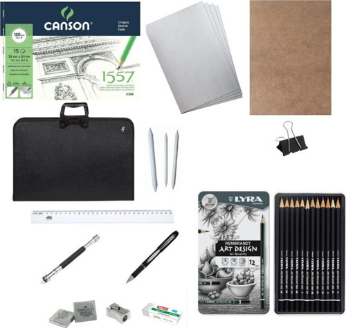 Kara Kalem ve Eskiz Başlangıç Seti 45 Parça: 1 Canson 120gr 35x50 Çizim Defteri 2 Mopak 35x50 Çizim kağıdı 20 adet 3 Duralit 35x50 4 Kıskaç 5 Kalem Dağıtıcı 3'lü Set 6 Proje Çantası 35x50 7 Hatas Cetvel 30cm 8 Kalem Uzatma Aparatı 9 Uni Ball Kalem Silgi 10 Faber Castell Hamur Silgi 11 Bigpoint Kalemtraş 12 Bigpoint Silgi 13 Lyra Art Design Dereceli Karakalem Eskiz Çizim Seti 12'li