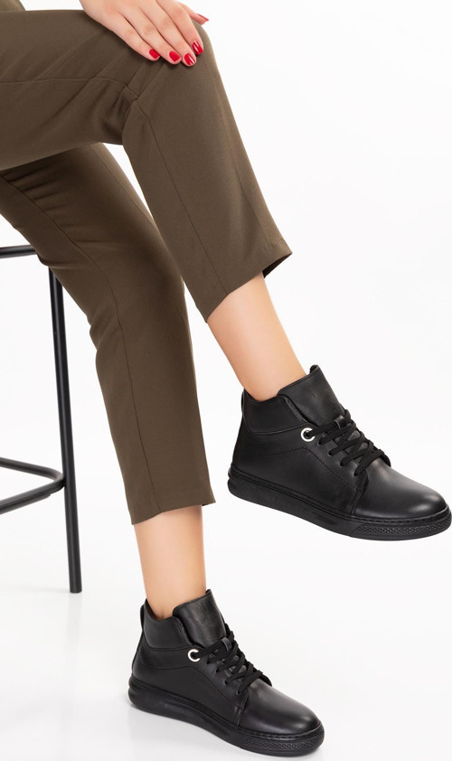 Artı-Artı001-1303 Hakiki Deri Ortopedik Kadın Siyah Bağcıklı Bot