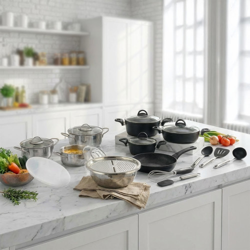 Bu 22 parçalık çeyiz seti, günlük yemek pişirmeden özel davetlere kadar her türlü mutfak ihtiyacını karşılamak üzere tasarlanmıştır. Set çelik ve granit parçaların birleşimiyle hem dayanıklılığı hem de performansı ön planda tutar bu sayede tek bir setle çok yönlü kullanım sağlar.