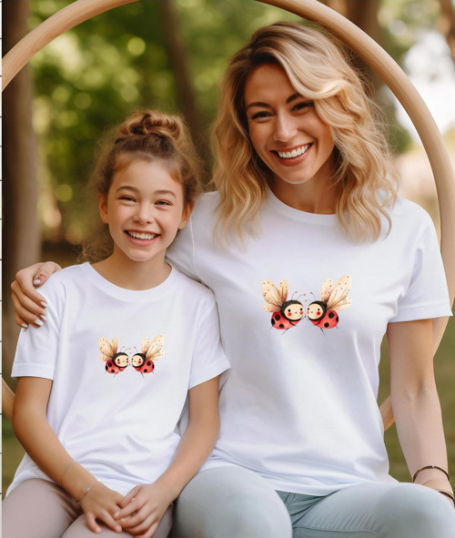 - Sevimli arı baskısı ile süslenmiş, hem anne hem de kız çocuklarına özel tasarlanmış tişört kombini.