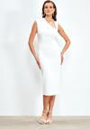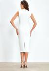Asimetrik yaka, kolsuz, arka fermuarlı kapama, arka yırtmaç detaylı, esnek, midi boy elbise.