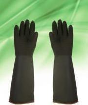 kimyasal maddelere karşı koruma amaçlı kullanılan siyah kauçuk eldivenleri ifade ediyor. Bu tür eldivenler genellikle laboratuvar ortamlarında, kimya endüstrisinde ve benzeri alanlarda kullanılır.