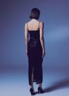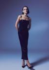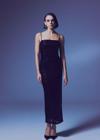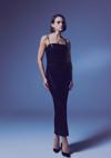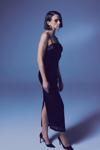 Düz yaka, ayarlanabilir ip askılı, arka yırtmaçlı, iç astarlı, arka fermuarlı, midi payet elbise.