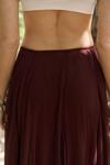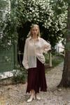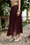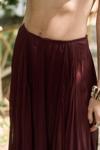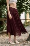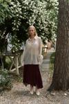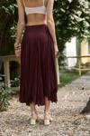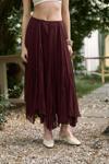 Kırışık dokulu, hafif ve dökümlü uzun etek. Yüksek bel kesimli, asimetrik ve volanlı etek ucu ile hareketli bir görünüm sunar. Çift kat formda.