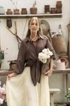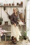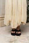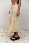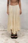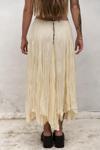 Kırışık dokulu, hafif ve dökümlü uzun etek. Yüksek bel kesimli, asimetrik ve volanlı etek ucu ile hareketli bir görünüm sunar. Çift kat formda.
