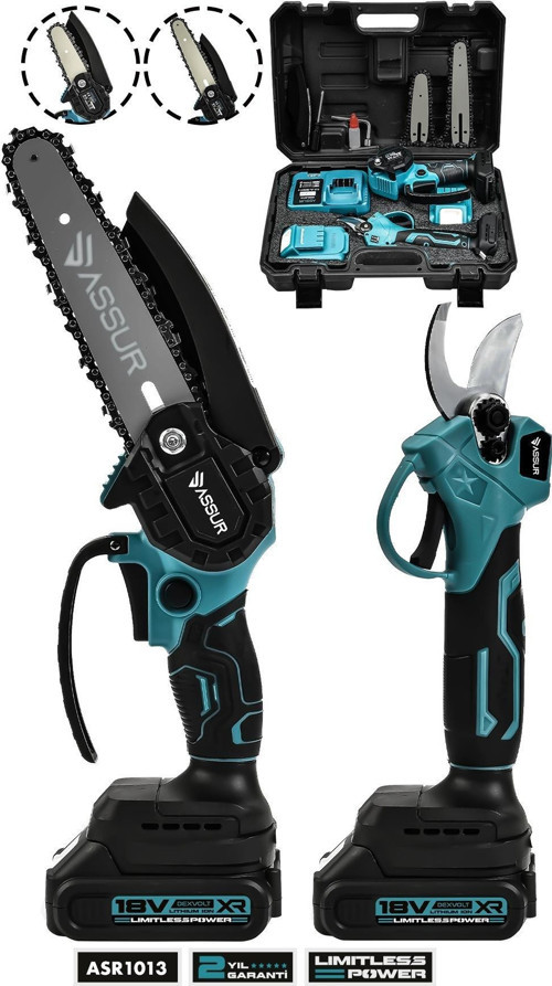 ASSUR Akülü Budama Makası ve Budama Testeresi Seti, bahçe ve tarım işlerinizde ağaç ve çalıların budanması için tasarlanmış, akülü ve taşınabilir bir settir. 18V XR Li-Ion güçlü bataryası ile kablosuz ve yüksek performanslı budama işlemleri yapabilirsiniz. 1500mAh çift aküsü ve 5 pilli dahili bataryası, uzun süreli kullanımlarda bile kesintisiz performans sağlar. 60 dakikalık hızlı şarj süresi, işlerinize hız kazandırır. Metal şanzıman, dayanıklılık ve uzun ömürlü kullanım sağlar. Set, bir adet budama makası ve bir adet budama testeresi içerir. Budama makası 35mm kesim çapına sahipken, budama testeresi 10 cm (4 inç) veya 15 cm (6 inç) pala uzunluğunda ve 14/18 dişli zincir seçeneklerine sahiptir. 4 kg'lık hafif tasarımı, kullanımı kolay ve pratiktir. 2 yıl garanti süresi, ürünün kalitesine ve dayanıklılığına olan güveni gösterir.