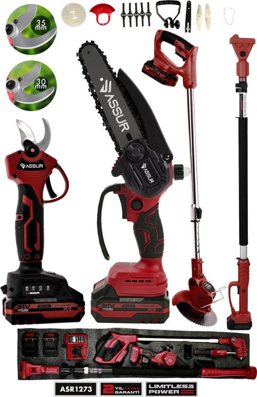 Assur 4'lü Set 21V Çift Akülü Teleskopik Dal Budama Makinesi & Şarjlı Tırpan Çim Biçme Makinesi Kırmızı
