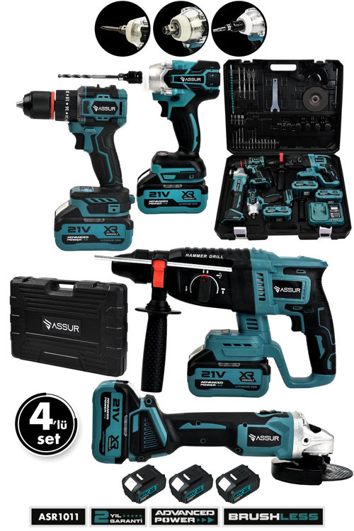 ASSUR 4'lü Set, inşaat, tadilat, montaj, otomotiv ve ev atölye işleriniz için tasarlanmış, çok yönlü ve güçlü bir akülü el aleti setidir. Set, bir adet taşlama makinesi, bir adet darbeli somun sıkma makinesi, bir adet kırıcı delici hilti ve bir adet darbeli vidalama makinesi içerir. 21V XR Li-Ion güçlü bataryası ve kömürsüz motoru (taşlama, somun sıkma, hilti) sayesinde yüksek performans sunar. 2.0Ah 3 adet aküsü ve 10 pilli dahili bataryası, uzun süreli kullanımlarda bile kesintisiz performans sağlar. 60 dakikalık hızlı şarj süresi, işlerinize hız kazandırır. Metal şanzıman ve çelik mandren, dayanıklılık ve uzun ömürlü kullanım sağlar. Optimize edilmiş soğutma sistemi, motorların aşırı ısınmasını önler ve performanslarını artırır. 2 konumlu kol, optimum kontrol sağlar. LED aydınlatma, karanlık ortamlarda bile rahat çalışma imkanı sunar. 10 kg'lık hafif tasarımı, kullanımı kolay ve pratiktir. 2 yıl garanti süresi, ürünün kalitesine ve dayanıklılığına olan güveni gösterir.