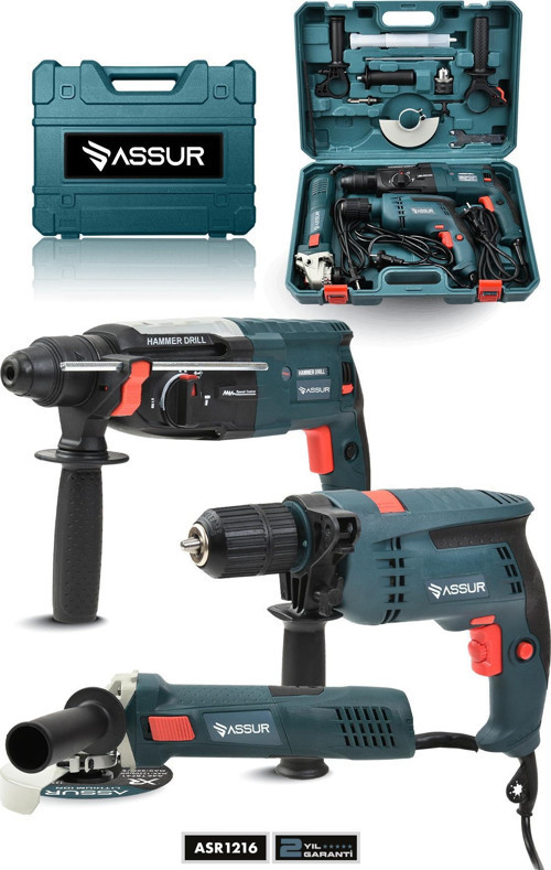 ASSUR 3'lü Set, inşaat, tadilat ve atölye işleriniz için tasarlanmış, şebeke elektriğiyle çalışan güçlü ve çok yönlü bir el aleti setidir. Set, bir adet Döner Çekiç (Hilti), bir adet 125mm Avuç Taşlama Makinesi ve bir adet Darbeli Matkap içerir. Tüm aletler dayanıklı metal şanzımanlara ve güçlü kömürlü motorlara sahiptir. Bu set, beton kırma ve delme, metal kesme ve zımparalama, ahşap ve metal delme gibi zorlu görevleri başarıyla yerine getirmek için gerekli olan gücü ve performansı sunar. Toplam 6 kg ağırlığıyla taşınması kolaydır. ASSUR güvencesiyle 2 yıl garanti süresiyle sunulmaktadır.