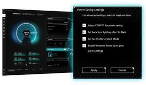 Güç Tasarrufu işlevi, güç tüketimini optimize etmek ve enerji tasarrufunu artırmak için çeşitli ayarlar barındırır. CPU güç limitini etkinleştirebilir, Aura aydınlatmayı kapatabilir ve fan profilini güç tasarrufu moduna getirebilirsiniz. Ayrıca Microsoft Windows’un barındırdığı Güç Tasarrufu planını açabilirsiniz.