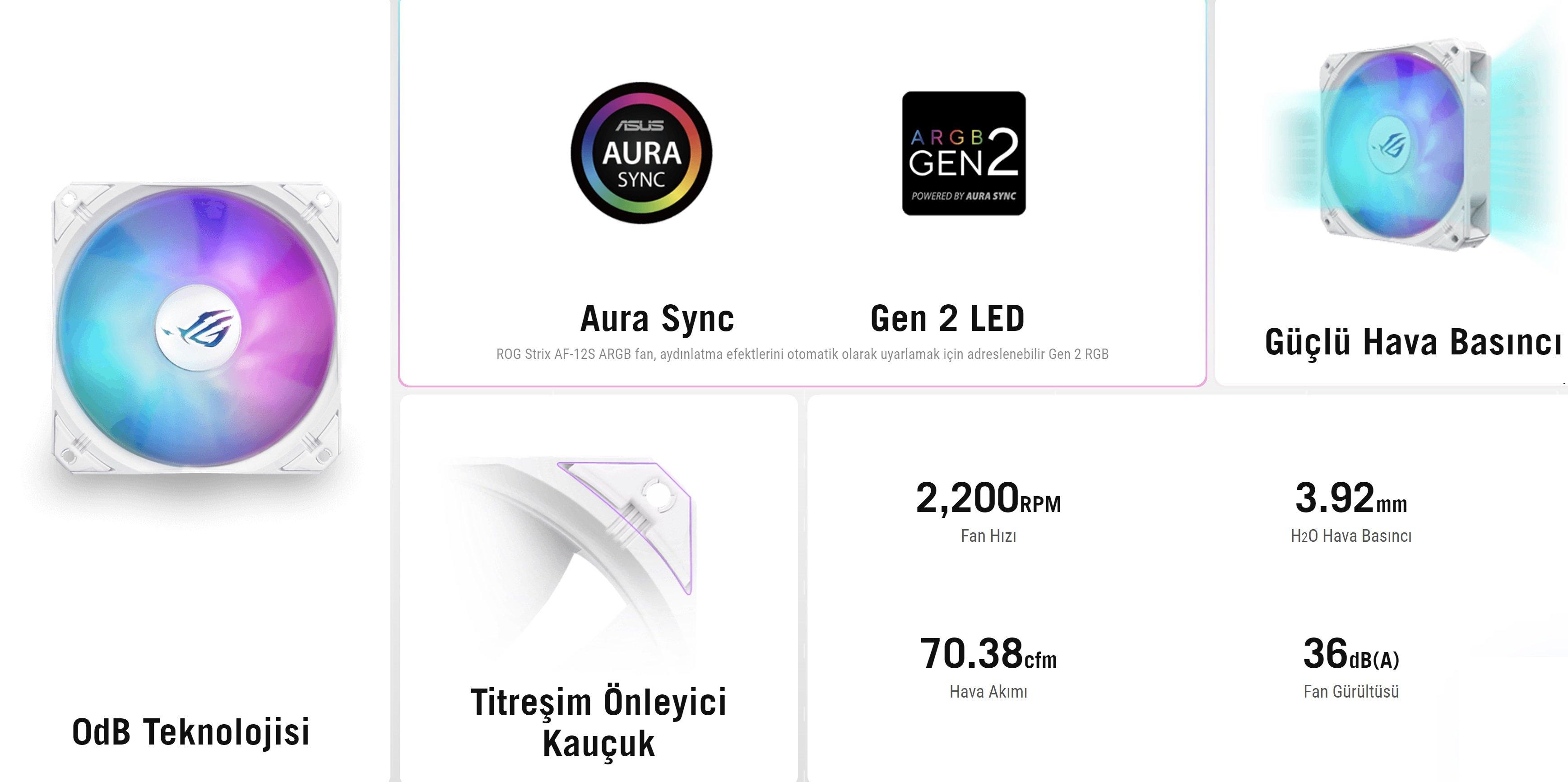 Birinci sınıf ROG ARGB fanlar, yüksek hava akışı, optimize akustik ve 0dB teknolojisi barındırır.