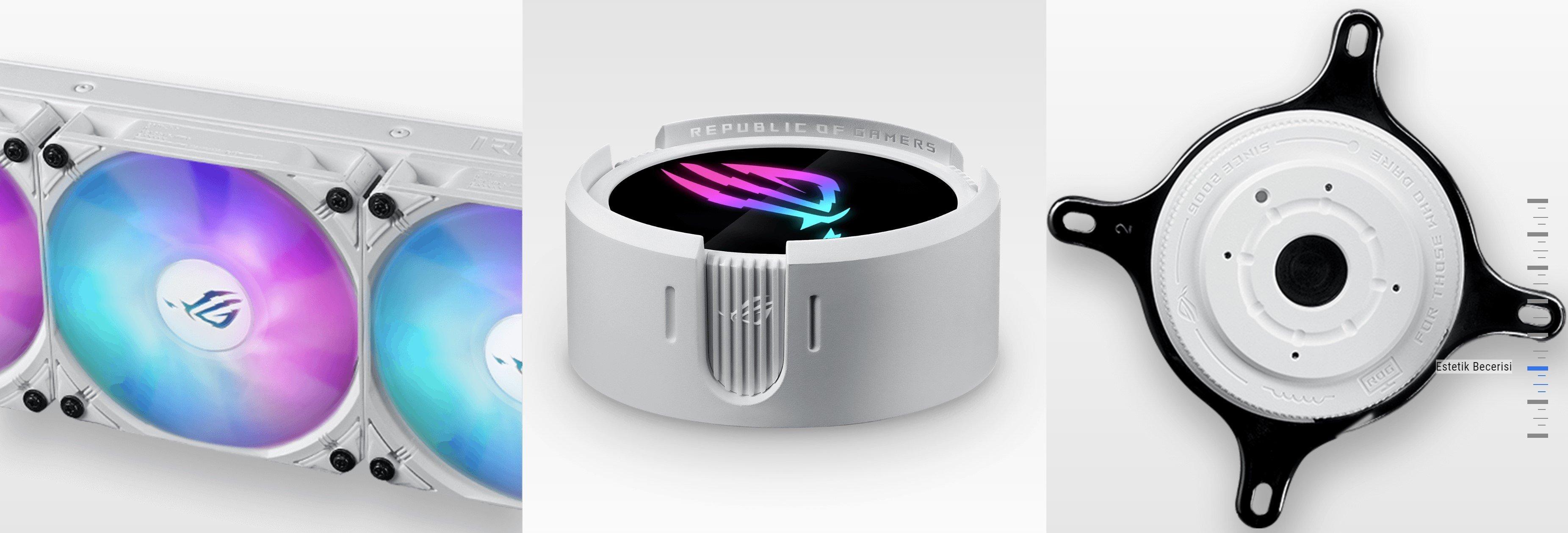 ROG Strix LC III ARGB hepsi bir arada CPU sıvı soğutucu, 360° döndürülebilen su bloğu, yeni Asetek Gen7 v2 pompa, birinci sınıf ROG ARGB fanlar ve 10+ özel Aura aydınlatma efekti.
