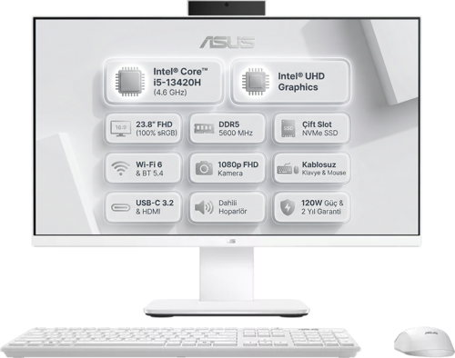 Gücünü 13. Nesil Intel Core i5-13420H işlemciden alan ASUS V400 AiO, DDR5 5600 MHz bellek teknolojisi ile en zorlu uygulamaları ve çoklu görevleri sorunsuz gerçekleştirir. İnce çerçeveli NanoEdge ekranı, %100 sRGB renk doğruluğu ile görsel deneyiminizi güçlendirir.