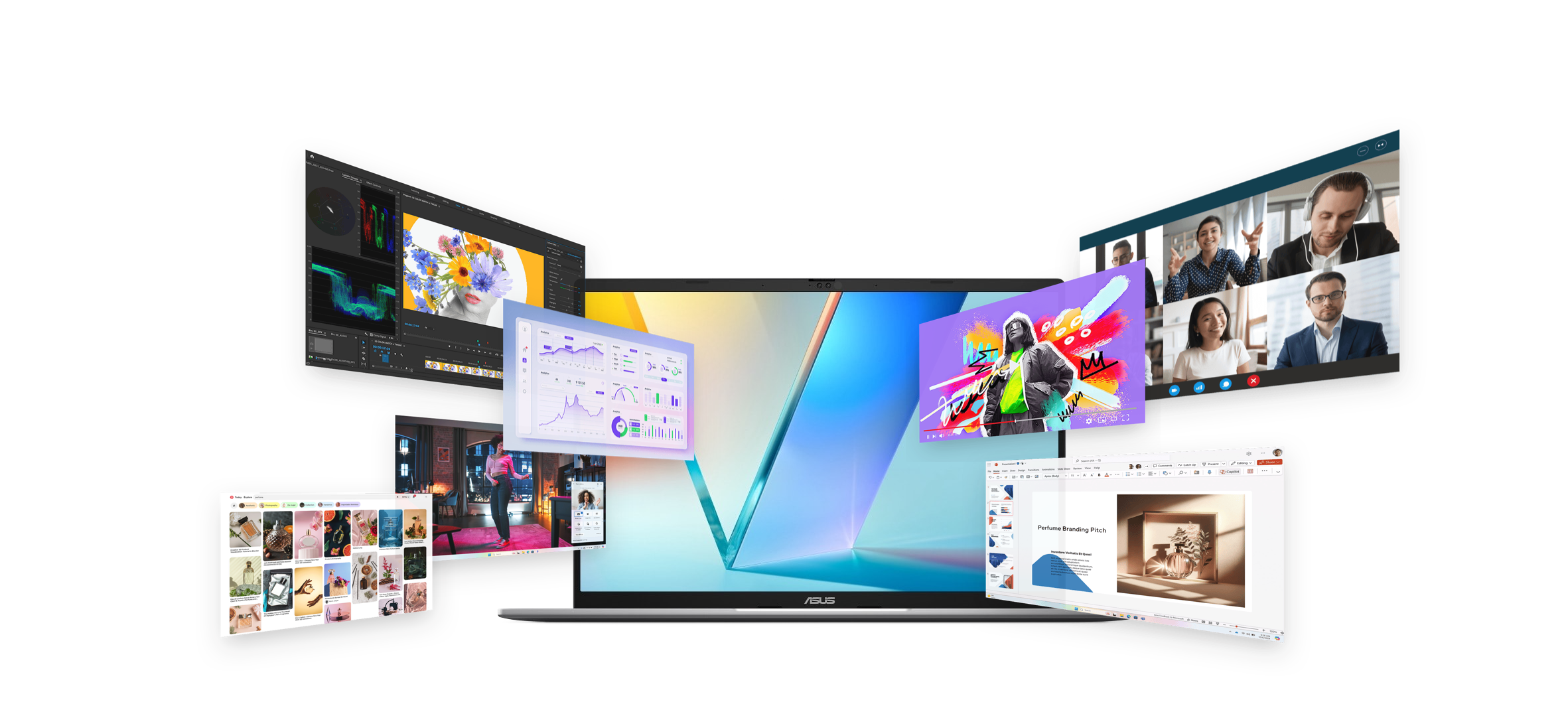 ASUS Vivobook S16, net ve canlı görseller sunan, yansıma önleyici kaplamaya sahip etkileyici bir 16:10 FHD IPS 144Hz ekran ile geliyor. Daha geniş ekran, üretkenliği artırırken, akıcı görseller çalışma, öğrenme ve eğlence sırasında daha sürükleyici bir deneyim sunar.